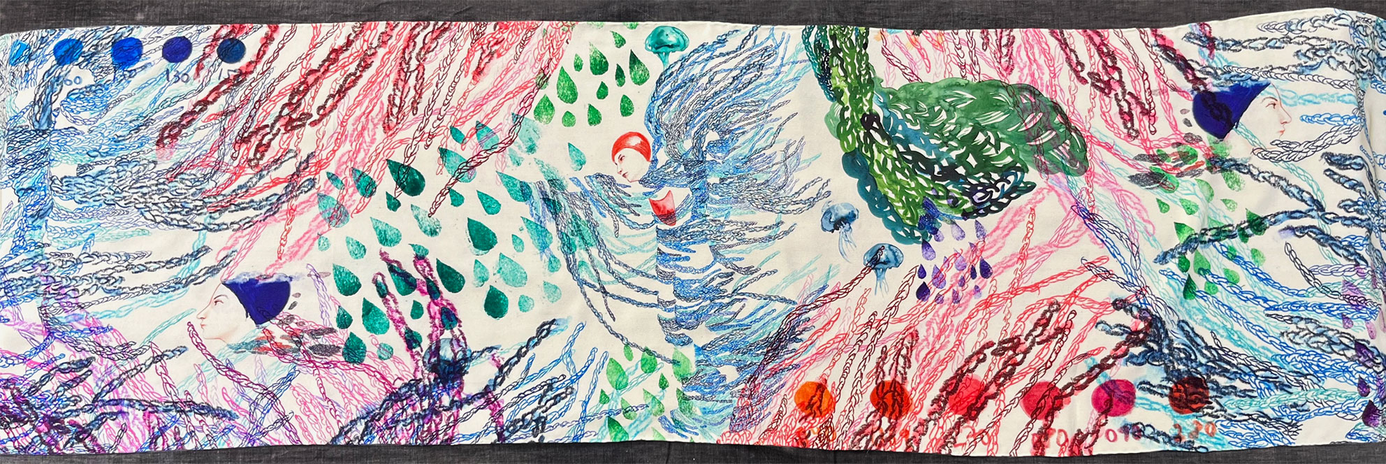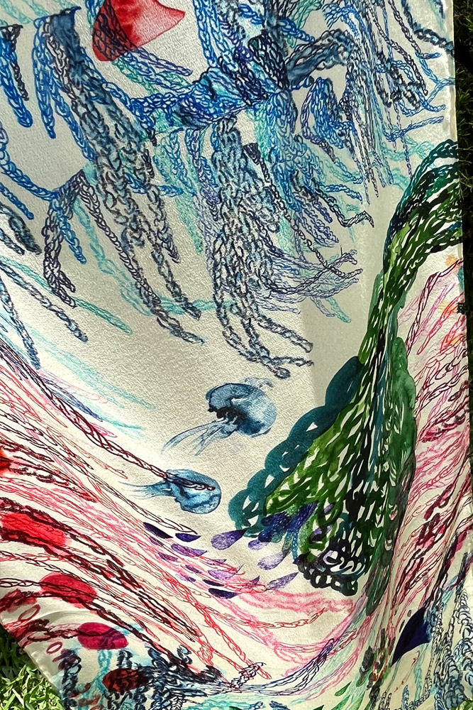 Pañuelo en crepe de seda 100%, con dibujos originales. Disponible en 150×45 cm. Orillado hecho a mano. Edición limitada. Hecho en España.