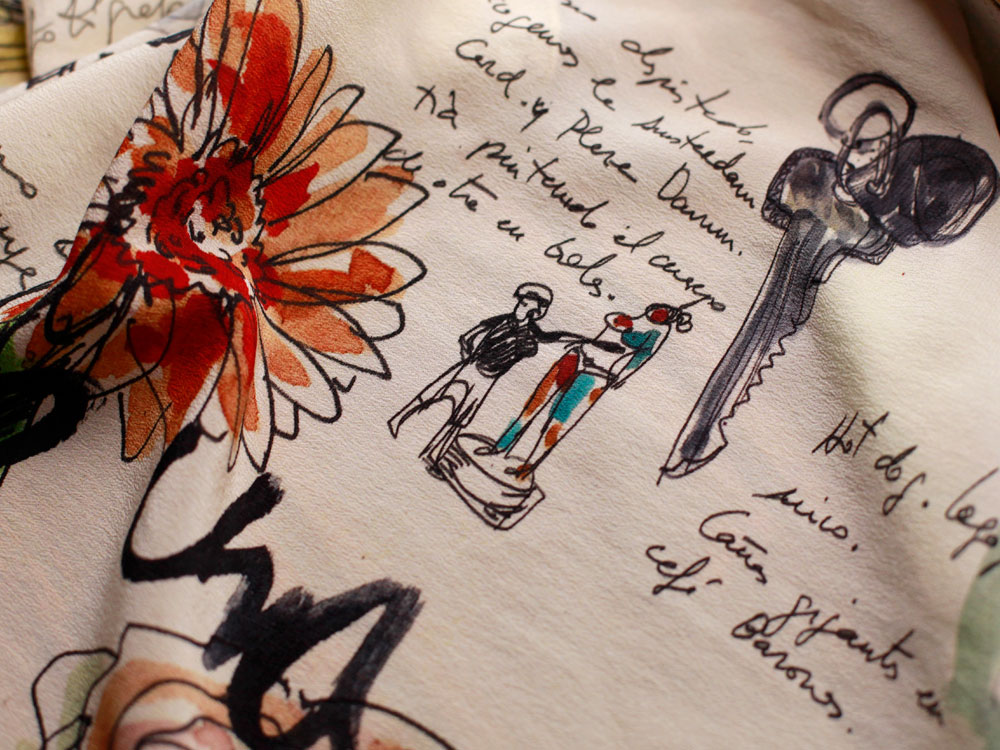 Pañuelo en crepe de seda 100%, con dibujos originales. Disponible en: 150×45 cm. Orillado hecho a mano. Edición limitada. Hecho en España.